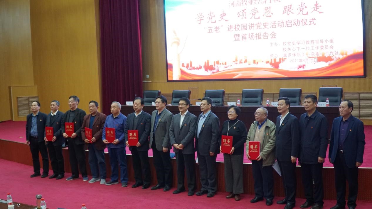 启动仪式上,学校领导为“五老”宣讲团成员颁发聘书。