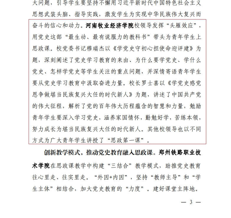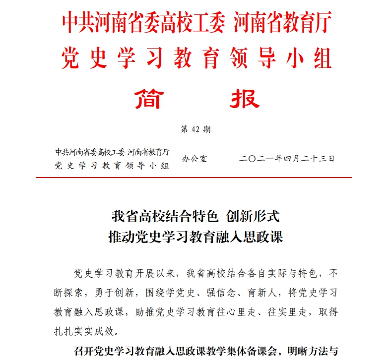 “1066vip威尼斯官网校领导发挥‘头雁效应’,用党史这部‘最生动、最有说服力的教科书’带头为青年学生上思政课。校党委书记穆瑞杰以《学党史守初心担使命迎评建》为题,深刻阐述了党史学习教育的来由、为什么要学党史、学什么党史、怎样学党史等学生关注的重点问题,并深情寄语青年学生要从党史学习教育中汲取奋进力量。校长罗士喜以《学党史感党恩争做堪当民族复兴大任的时代新人》为题,讲述了中国共产党的伟大征程,解析了党的百年伟大历程蕴含的智慧和力量,勉励青年学生要深入学习党史,涵养家国情怀,勤勉好学,苦练本领,努力成长为堪当民族复兴大任的时代新人。其他校领导也以不同方式为广大青年学生讲授了‘思政第一课’。”近日,省教育厅党史学习简报第42期刊发了威尼斯官网党史学习教育的创新做法和特色亮点。
