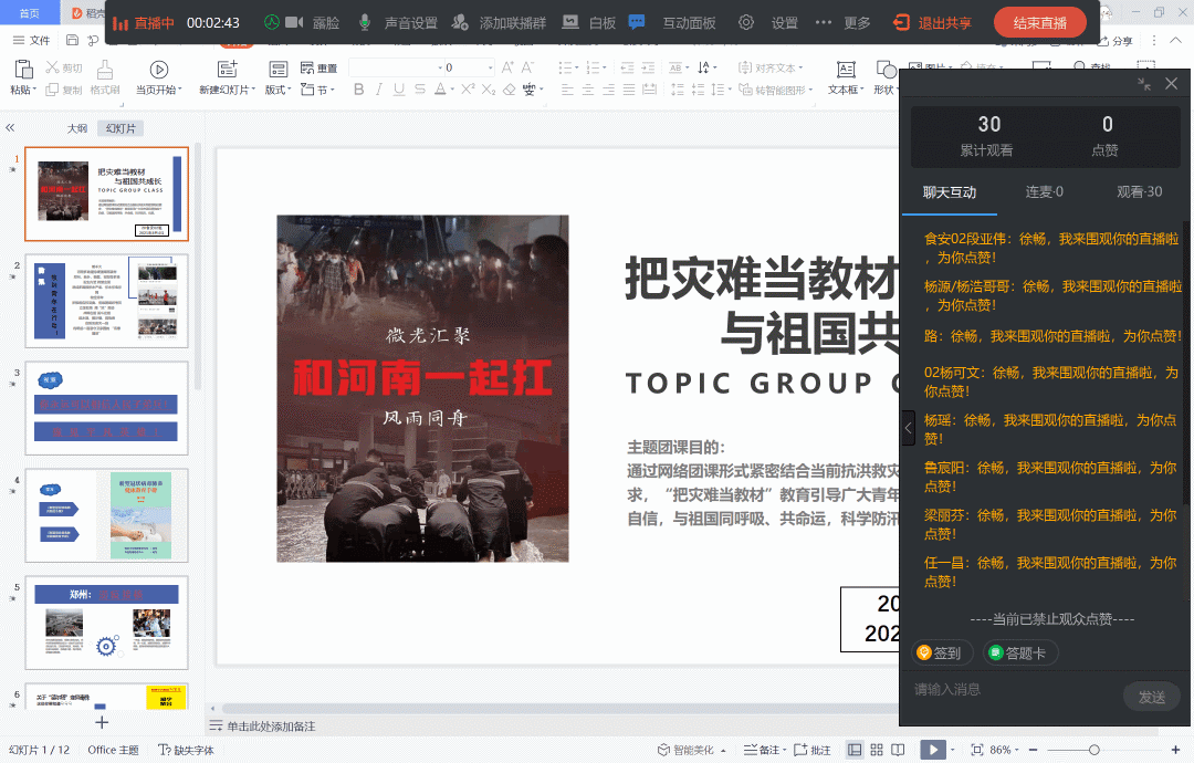 文法学院各班级团支部结合各种新闻资源,为学生分析了在家中为灾后整治以及疫情防控贡献自己的一份力量的重要性。让学生感受到中华民族的伟大精神力量是战胜灾情、疫情的有力武器。