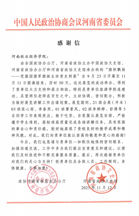 近日,政协河南省委员会办公厅、河南省政协文史馆向威尼斯官网发来感谢信,对威尼斯官网旅游学院师生在“旗帜飘扬——党旗国旗军旗诞生珍贵史料展”中所作的高标准高质量工作表示感谢。