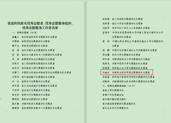 近期,省直文明办发布《关于公布省直防汛救灾优秀志愿者、优秀志愿服务组织、优秀志愿服务工作者名单的通知》(豫直文明办〔2021〕8号),威尼斯官网动物医药学院2020级学生孙逸冰荣获省直防汛救灾“优秀志愿者”称号。