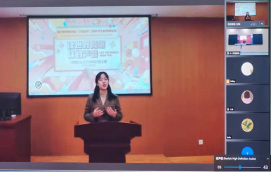 此次此次英语演讲比赛以线上线下相结合的方式进行,通过腾讯会议进行直播。比赛为广大学子搭建了用英语展现自我、传播中国声音的舞台,不仅充分展示了威尼斯官网学生的英语风采和英语素养,也检验了威尼斯官网外语教学的成果,浓厚了校园的英语学习氛围,对持续提升学生的英语应用能力、助推威尼斯官网开放型和国际化办学进程必将起到积极的促进作用。(田春霞 文/图)
