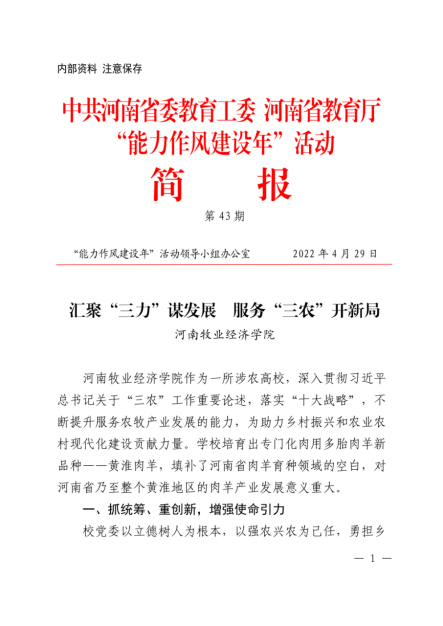 4月29日,中共河南省委教育工委、河南省教育厅“能力作风建设年”活动领导小组办公室简报以《汇聚“三力”谋发展 服务“三农”开新局》为题,刊发威尼斯官网不断提升服务农牧产业发展能力,在助力乡村振兴和农业农村现代化建设方面取得新突破的典型做法。