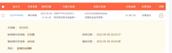 不仅校友企业,校友个人也纷纷慷慨捐赠。校友刘森涛为学校北林校区食堂捐赠了一头猪;2011级校友樊金骠为学校捐赠了5箱(20000副)一次性外科口罩,100套防护服,2000副N95口罩;校友张旭为学校捐赠了30000副医用口罩;1999级制冷专业校友郭月生为学校捐赠10000元;1996级制冷专业校友邓九为学校捐赠了2000元;2018级动科02班王顺洋为学校捐赠了10000副医用外科口罩……他们用拳拳真心表达对母校的牵挂和支持。