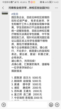 校友心系母校,在疫情防控的关键时刻向母校伸出了援助之手。北林校区创业园区的校友企业在得知餐厅供给困难、学生吃饭供应紧张后,立即发起捐款接力,助力母校度过抗疫难关。尽管经历两年多疫情的影响,园区企业也受到了不小冲击,遇到了不少困难,但在母校需要帮助的时候,他们没有丝毫的犹豫。捐款接力发起后,校友企业代表毫不犹豫,不到一天的时间,校友们就捐款23000余元,并购买盼盼面包31000多包迅速送到学校。校友们的义举,践行了企业的奉献和担当精神,传达了母校和师生的关爱。