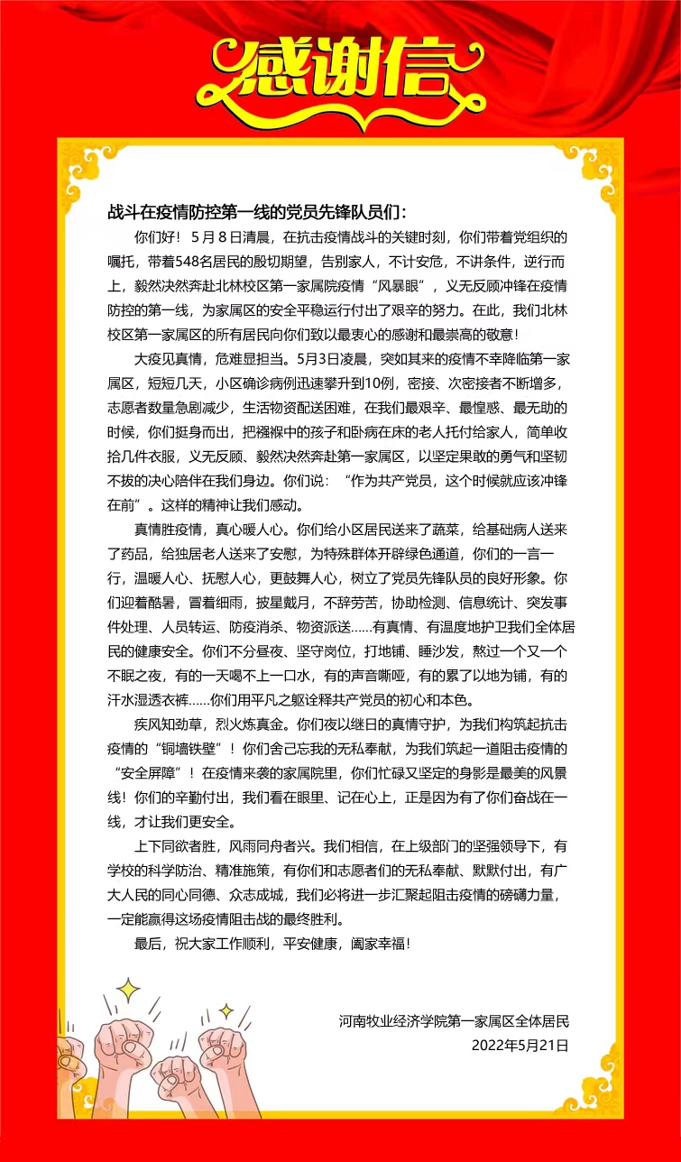 5月21日22时38分,郑州市新冠肺炎疫情指挥部办公室发布《关于调整封控管控区域的通告》(2022年104号),自5月22日零时起,学校北林校区第一家属院、第二家属院解除封控管理,恢复正常生产生活秩序。