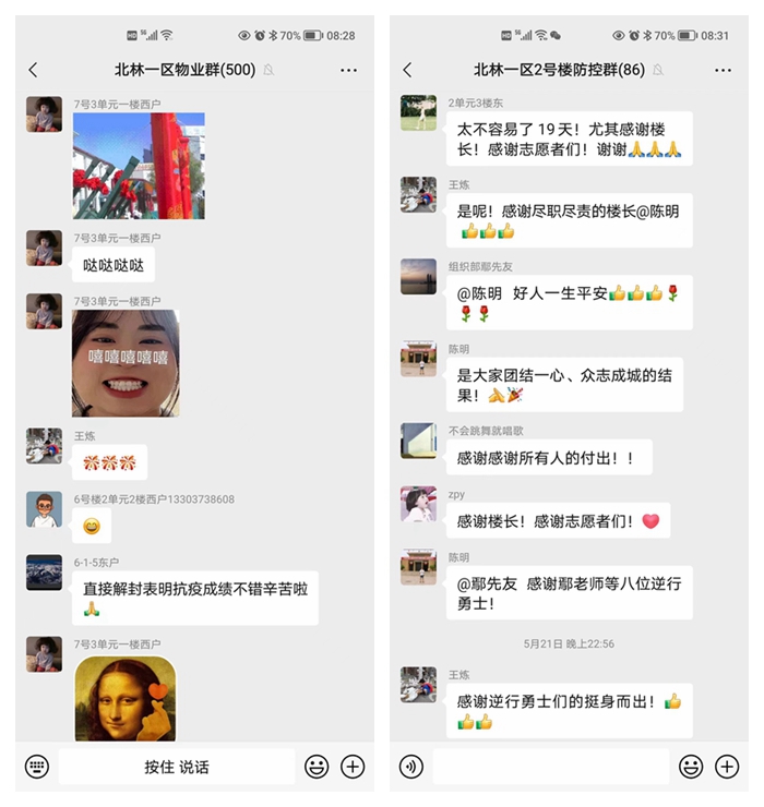 “解封啦!谢谢你们,你们辛苦了!”值得一提的是,在解封当晚,小区微信群里还上演了暖心的一幕。居民们纷纷向这些天抗疫的党员先锋队员们、志愿者等人致敬,喊话表示感谢,并送去了感谢信。