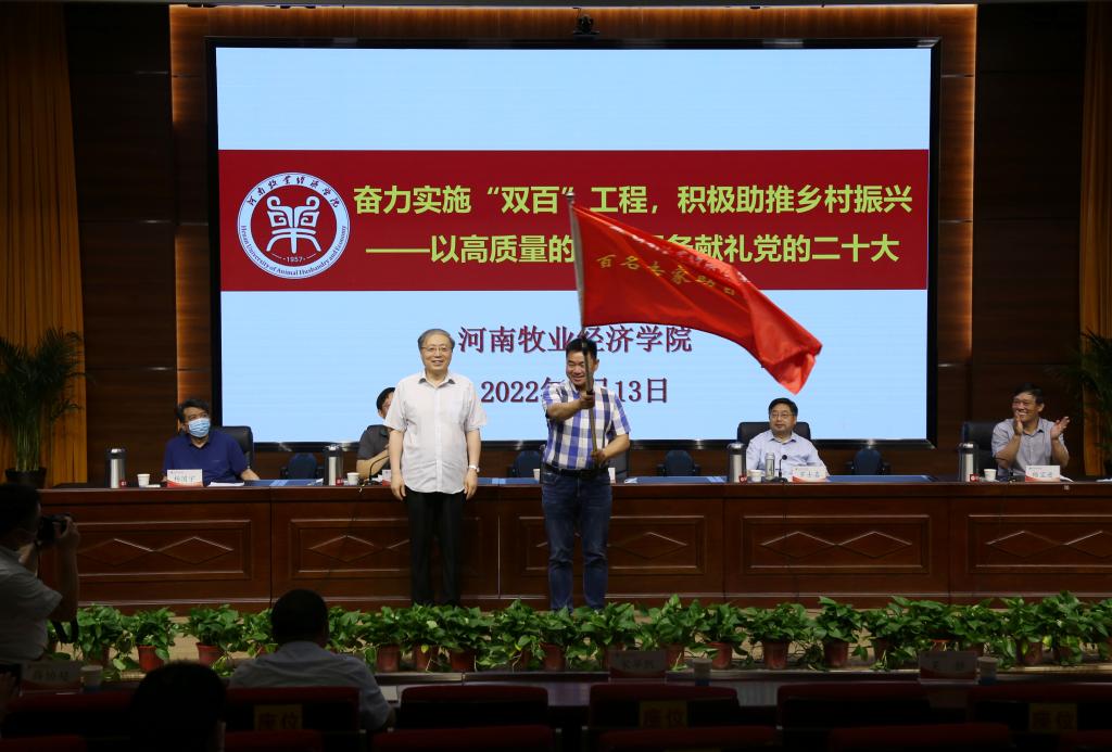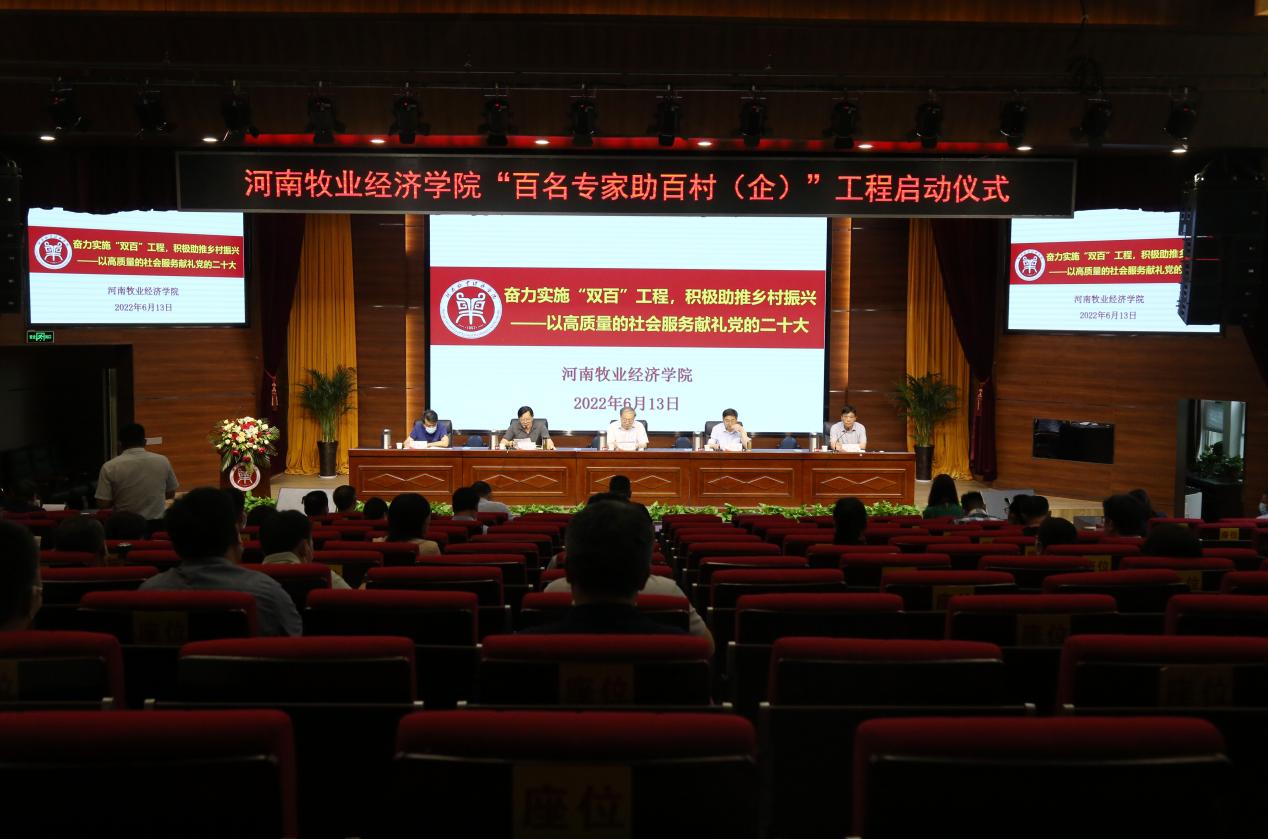 为奋力实施“百名专家助百村(企)”工程(“双百”工程),积极助推乡村振兴,6月13日下午,学校在龙子湖校区一号教学楼合100报告厅举行“双百”工程启动仪式。校党委书记穆瑞杰,校长罗士喜,校党委副书记李俊杰,副校长杨宝进、杨国宇出席仪式。校地合作代表、原阳县副县长李燚,相关职能部门负责人和各教学院部书记、院长等领导和专家代表参加仪式。启动仪式由李俊杰主持。