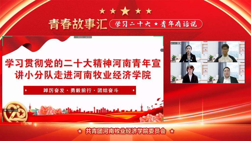 学习党的二十大,青年有话说。为深入贯彻落实《共青团河南省委关于认真学习贯彻党的二十大精神的通知》,11月20日下午,由校团委主办的青春故事汇——党的二十大精神河南青年宣讲小分队,通过线上平台直播的方式开展宣讲,全校师生积极交流观看。