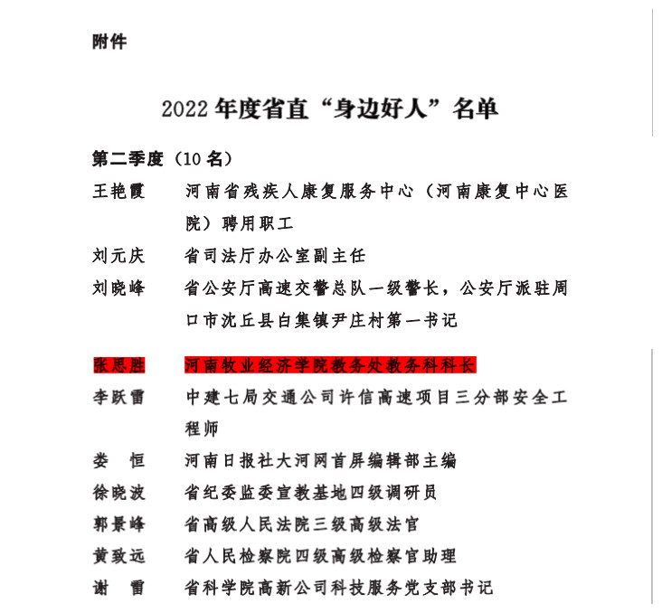 近日,河南省省直机关精神文明建设指导委员会办公室印发《关于公布2022年度省直“身边好人”上榜人物的通知》,威尼斯官网张思胜老师榜上有名,被授予2022年度省直“身边好人”荣誉称号。