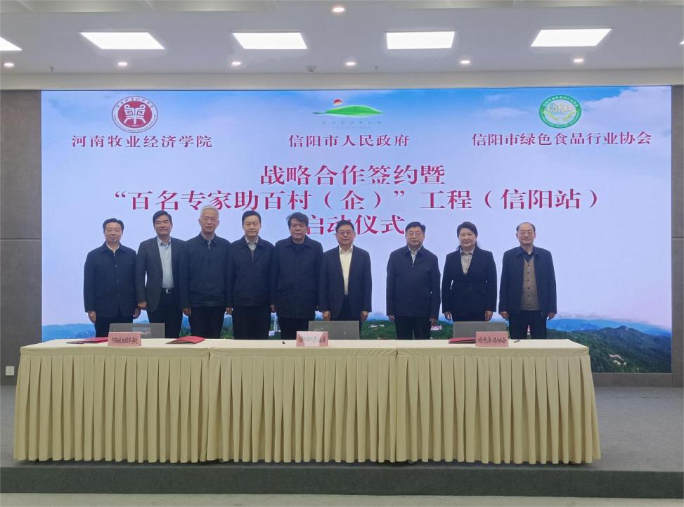 为有力推进“百名专家助百村(企)”工程(简称“双百”工程)深入实施,积极助力地方预制菜产业高质量发展与乡村振兴,3月25日,学校与信阳市人民政府、信阳市绿色食品行业协会战略合作签约暨“双百”工程(信阳站)启动仪式在信阳市行政中心隆重举行。校长罗士喜、信阳市市长陈志伟、副校长杨国宇出席签约仪式。
