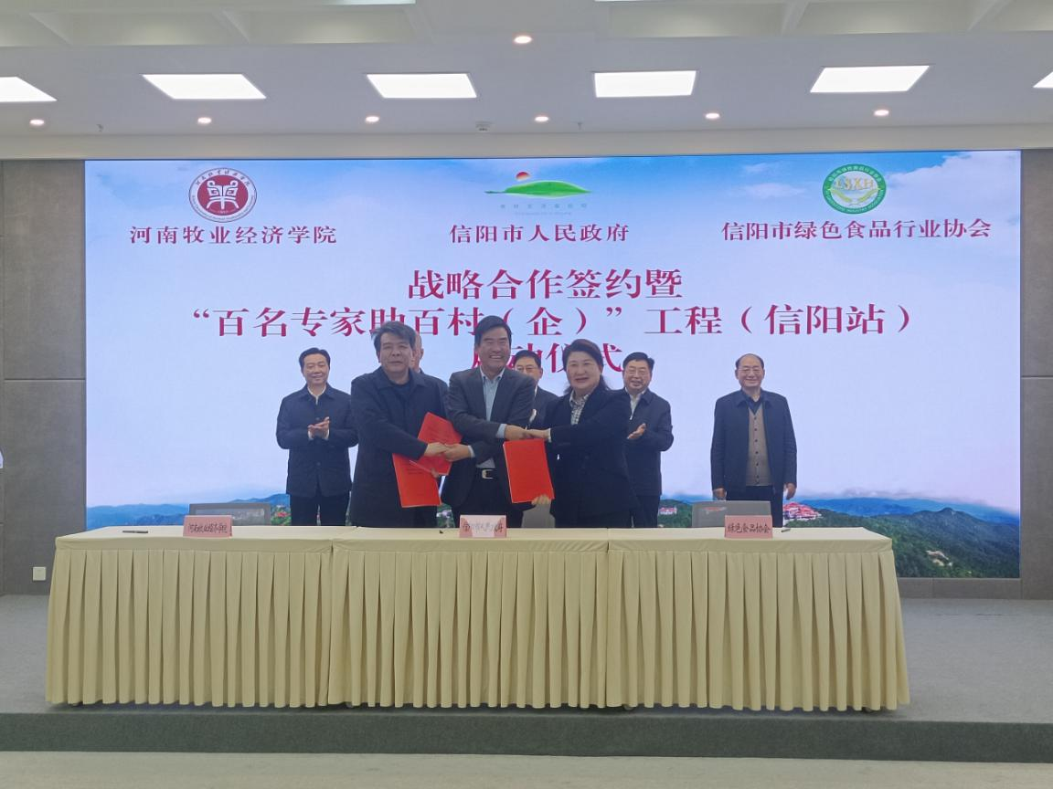 仪式上,杨国宇、信阳市副市长吕旅、信阳市绿色食品行业协会会长潘道荣代表校政协签署战略合作协议。