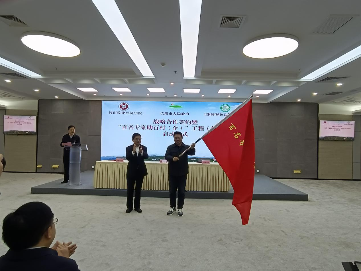 陈志伟为食品与生物工程学院邹建教授授旗。食品与生物工程学院张煌博士代表“双百”工程专家就如何发挥优势落实“双百”工程,助企兴村强产业、提教助研促就业作表态发言。