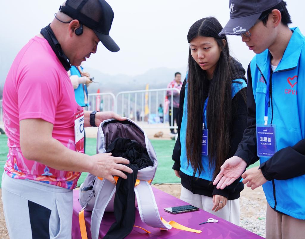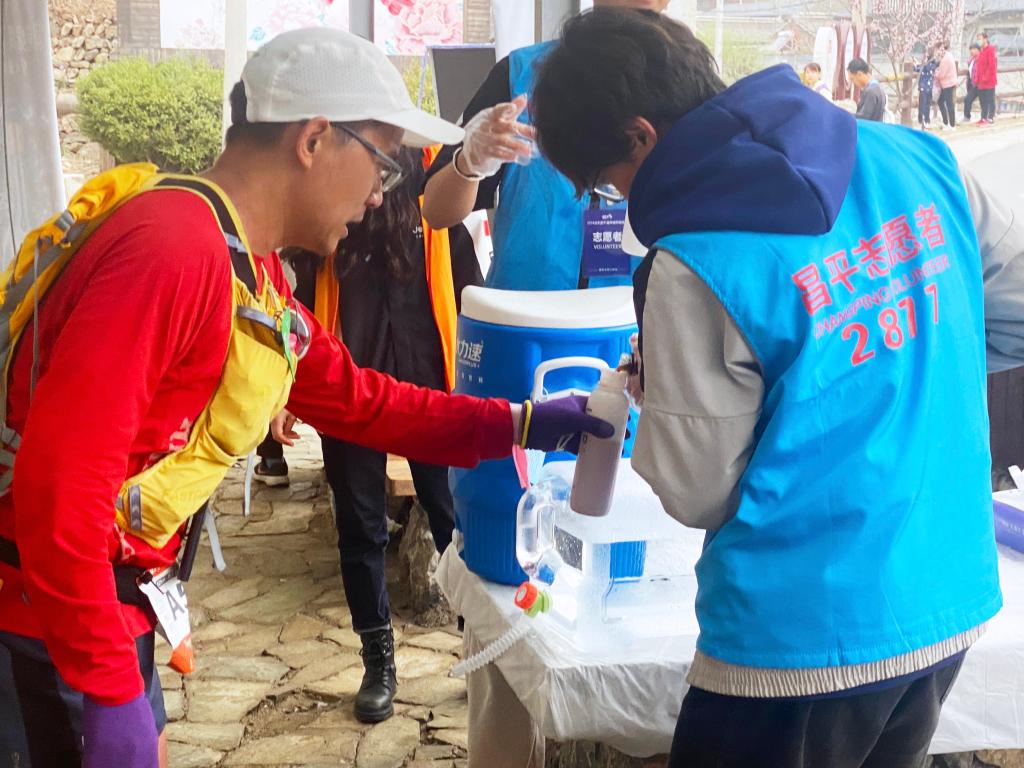 赛事当天,在越野赛道区域,志愿者们为选手提供道路指引;搬运摆放补给品,并向参赛选手进行发放;起终点,志愿者们热情地为选手呐喊助威,及时配合体能不支的选手开展帮扶和救助,他们用言语和行动向参赛选手们提供最有力的支持和鼓励。