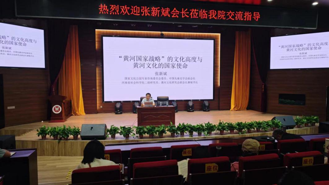 讲座中,张新斌以“‘黄河国家战略’的文化高度与黄河文化的国家使命”为题,结合自身30多年的工作经历以及对黄河文化的独到见解为师生们带来了一场内容充实、视野开阔的专业讲座。他从“黄河国家战略”所代表的区域发展态势开展论述,明确了黄河流域生态保护和高质量发展上升为重大国家战略的观点,分析了“黄河-长江国家战略”视野下文化传承的差异与互补,提出了“黄河国家战略”中重要论断所体现的中华文化高度与黄河文化所反映的中华文明突出特性,引导师生深入了解了黄河文化的定位、价值与意义。
