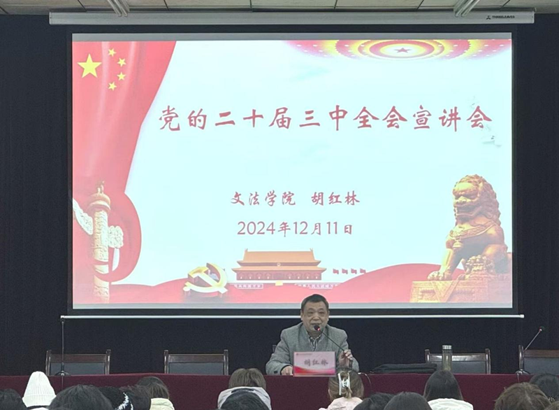 为深入学习贯彻党的二十届三中全会精神,近日,在英才校区E110会议室,文法学院党委书记胡红林为本院学生党员及入党积极分子宣讲党的二十届三中全会精神。