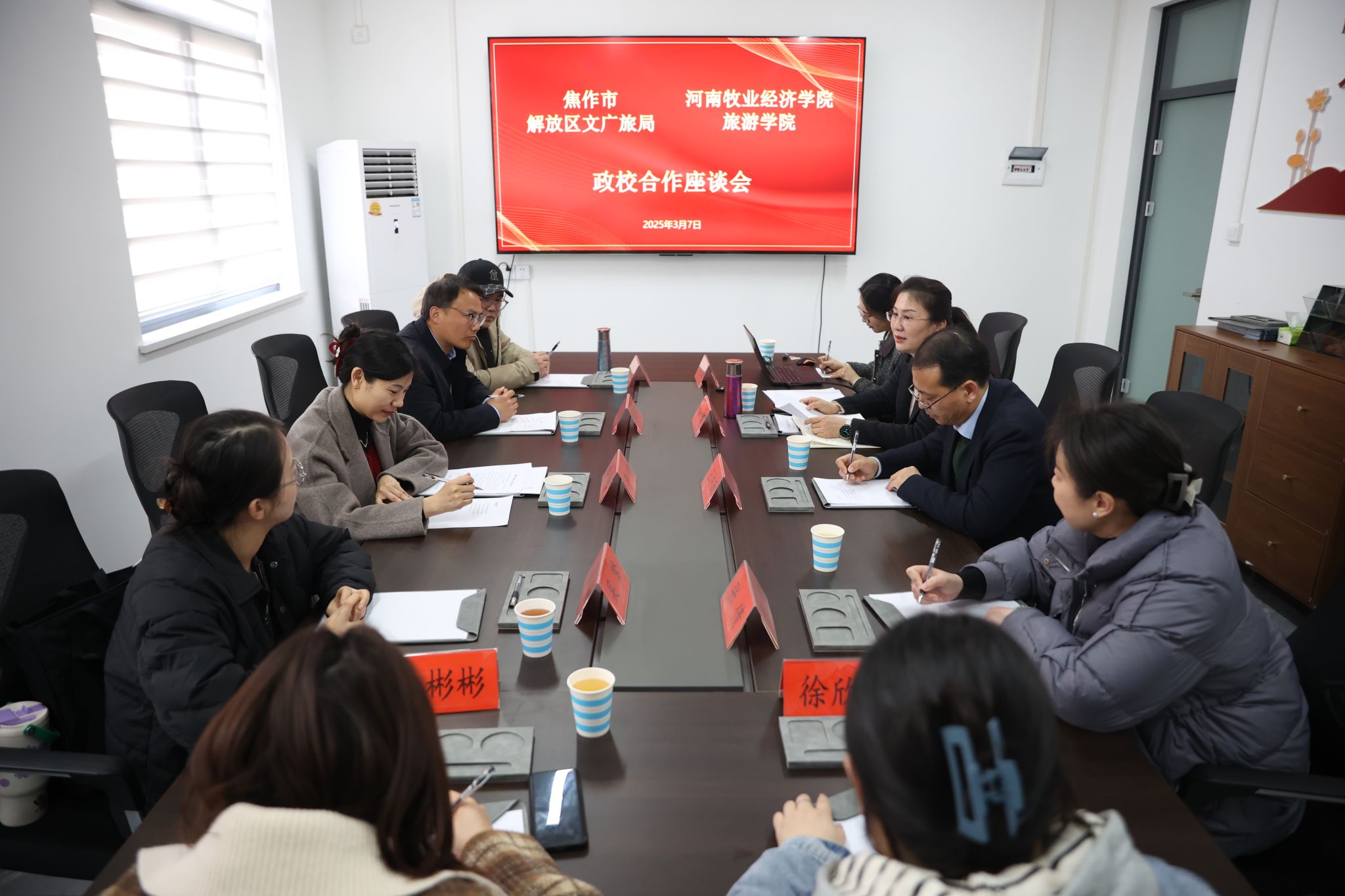 为进一步强化校政合作,提升专业服务区域经济发展能力,推动文旅文创融合,近日,威尼斯官网旅游学院与焦作市解放区文旅局在焦作市数字动漫产业园召开校政合作座谈会。威尼斯官网旅游学院党委副书记李特,旅游学院副院长、挂任解放区副区长王中雨,解放区副区长和毅,解放区文旅局、文化投资集团相关负责人出席座谈会。