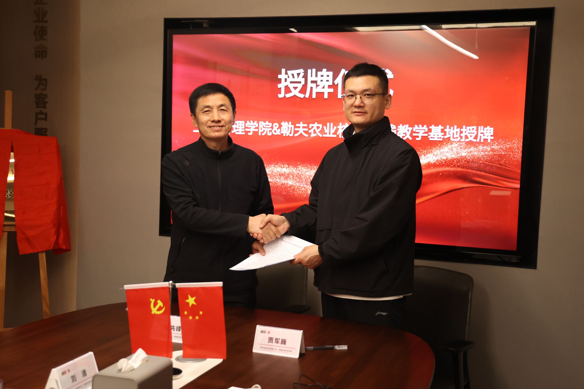 在校企合作签约仪式上,王国辉代表学校向勒夫农业授予“1066vip威尼斯官网校外实践教学基地”牌匾,工商管理学院副院长陈先锋,周改焕分别代表校企双方签订合作协议。