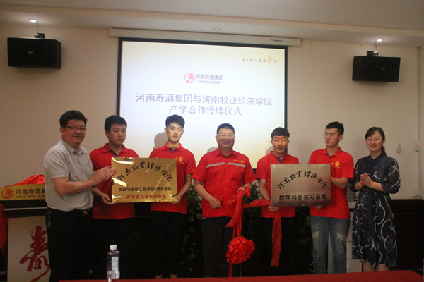 7月1日中午,在河南寿酒集团举办了大学生社会实践基地和教学科研实习基地授牌仪式,食品与生物工程学院·酒学院党总支书记赵安勇、副院长潘春梅、河南寿酒集团总经理李峰、副总经理牛广杰等参加了授牌仪式。赵安勇指出,学院旨在建设豫酒人才培养基地与技术高地,为豫酒振兴提供人才与技术支撑。他表示,我们要共同展望酿酒行业的美好未来,运用现代技术对酒业发展进行不断完善,为豫酒未来的发展携手共进。