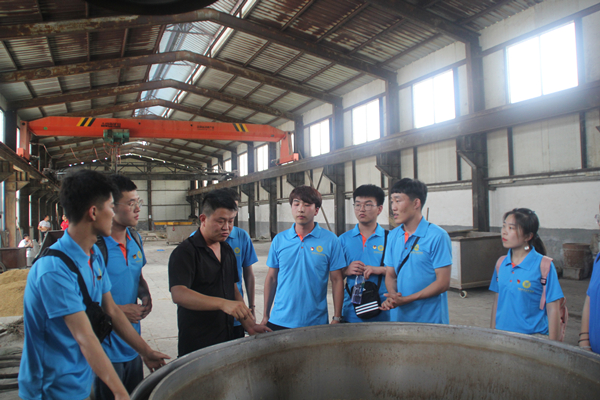 7月4日,服务队来到河南寿酒集团峪河曲酒生产基地进行实践学习。在厂区技术师傅的带领下,进入窖池车间,高效完成了15个窖池的护理工作,得到了技术师傅们的高度赞扬,峪河曲酒生产基地生产负责人马主任也结合生产经验耐心细致的解答了实践队员们在理论学习中所产生的疑惑。