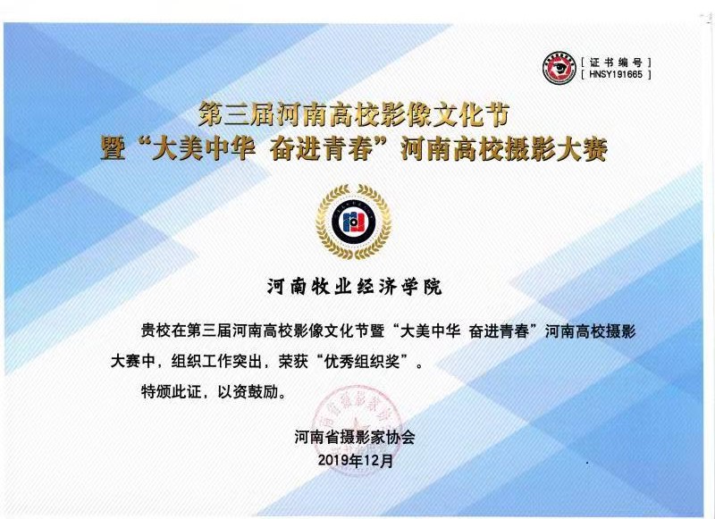 1月2日下午,第三届河南高校影像文化节暨“大美中华 奋进青春”河南高校摄影大赛颁奖仪式在郑州铁路职业技术学院举行,威尼斯官网被授予“优秀组织奖”荣誉称号。