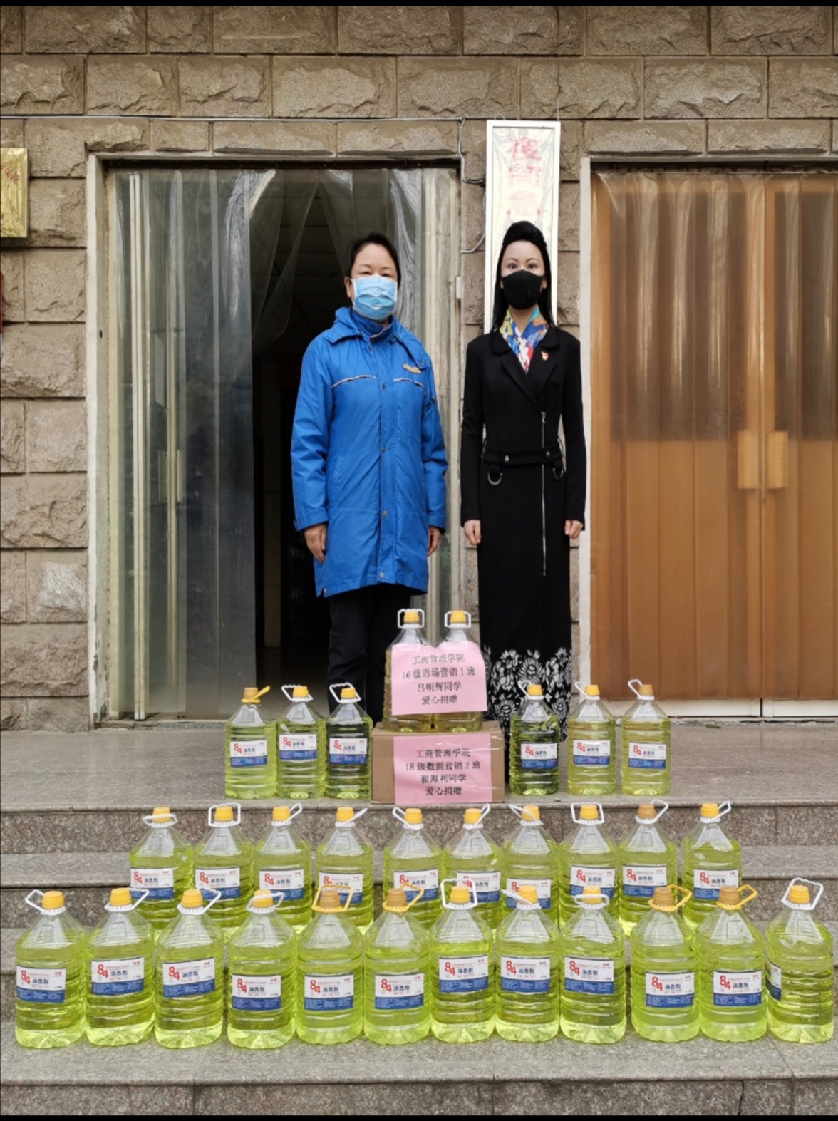 校医院院长梁天玉代表学校接受捐赠并表达感谢,这也是学校收到的第4份在校学生的捐赠。“现在是学校疫情防控的关键时刻,在看到学校领导深入一线检查指导疫情防控工作,全校师生都争相捐赠疫情防控所需物资,特别是看到周倩老师以个人名义捐赠了价值4000元的1000斤消毒液后,我们深受感动,作为预备党员、学生干部,也想把这种爱心接力下去,希望能尽自己最大的努力去保护我们的校园。”两位同学在电话采访中说。