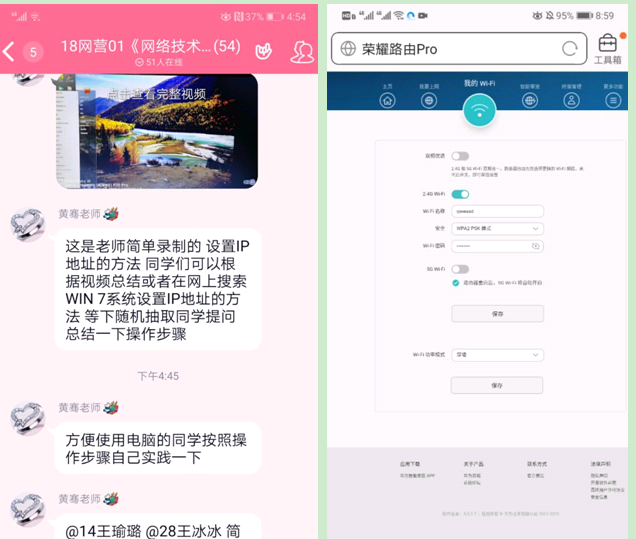 网络营销教研室的黄骞老师在开展《网络技术及应用》线上教学的过程中,结合课程特点和网络教学需求,发布个人录制设置路由器视频,同学们学以致用掌握了方法,重新设置了家里的路由器并进行相关设置。黄骞老师在我院开展线上教学的过程中,为该院教师演示了QQ群功能适合网课的各种细节功能,同过群内演示和个别指导的方式主动为学院全体老师提供线上教学的技术帮助,被教师们誉为“响当当的金牌主播”。