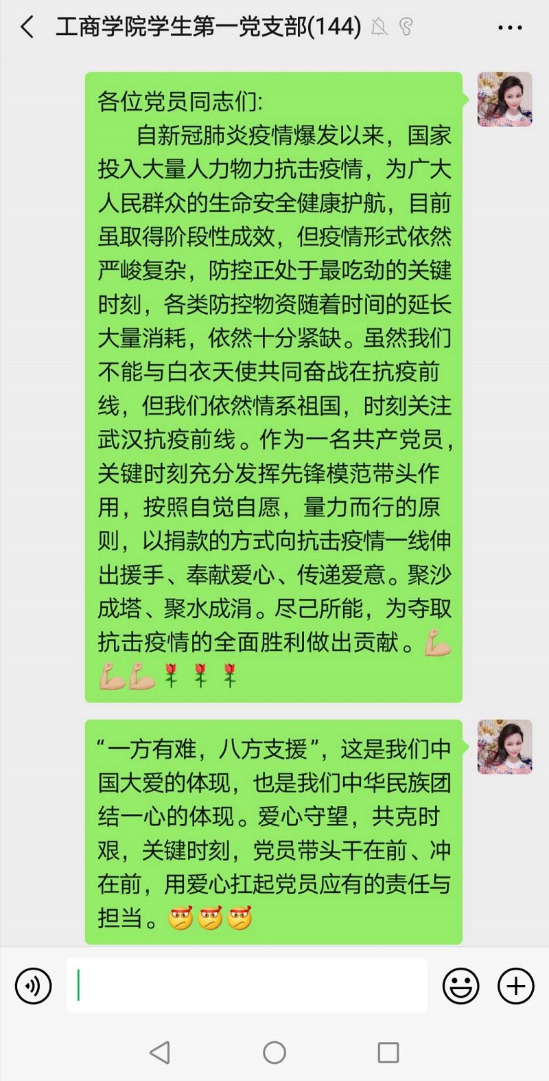 党支部书记周倩老师首先在微信工作群里发出倡议:号召全体党员充分发挥先锋模范带头作用,尽己之力,以捐款的方式向抗击疫情一线伸出援手、奉献爱心、传递爱意。随后周倩书记带头捐款1000元,并表达捐款感言:“一方有难,八方支援”,这是我们中国大爱的体现,也是我们中华民族团结一心的体现。爱心守望,共克时艰,关键时刻,党员带头干在前、冲在前,用爱心扛起党员应有的责任与担当。孟琪、李柯等其他几名党支部委员陆续献捐共计2200元,用行动表达了党员心系祖国,携手战“疫”冲锋在前的决心。