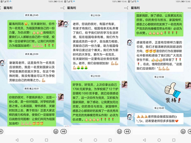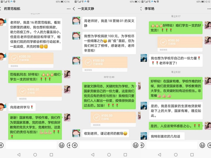 随后,多名学生党员,甚至一些毕业生党员都纷纷添加周老师的微信,主动要求捐款。50元、100元、200元、300元……一个个带着责任与担当、感恩之心、家国情怀的爱心捐款红包如潮水般涌入爱心捐款账号。 “作为在校大学生党员,同时还是一名受到国家以及学校恩惠的贫困大学生,在这特殊时期,我没有理由不为国家贡献自己的绵薄之力”,18营销(数据)2班的翟海利同学捐款时激动的说道。“作为毕业生党员,更作为中国人,我有义务更有责任在国家需要我们时贡献力量,我相信疫情将要过去,春天会温暖每个人心”,15级市场营销一班张梦珂在捐款时说道。“我始终相信中国,相信党能克服一切困难,带领我们早日战胜瘟疫”,19级市营升本三班张颖婕捐款时坚定说道。“有国才有家,有家才有我们,祖国母亲无私养育了我们,给予我们好的学习生活环境,现在祖国有难,我们作为家庭成员的一份子,自当鼎力相助,贡献自己的一份力量,助力祖国母亲早日度过这个难关”,很多党员在捐款时都纷纷表达了自己的家国情怀和责任担当。