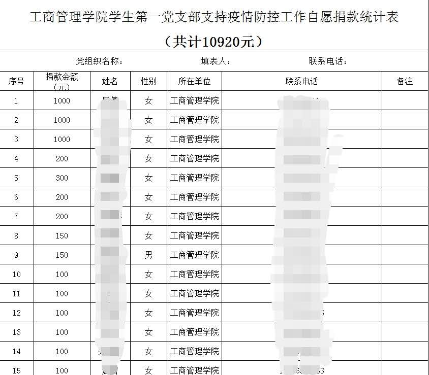 疫情无情人有情,为支持国家防控抗疫工作,积极响应中央和学校党委号召。3月3日上午,工商管理学院学生第一党支部发动支部党员开展捐款活动。经过一天的募捐,共收到党员捐款86笔,合计10920元。