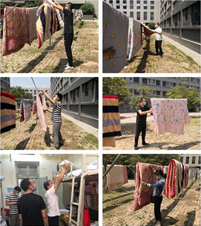 宿舍因长时间无人居住,空气不流通,阴暗潮湿。进入宿舍后,老师们首先对寝室进行开窗通风,将学生湿潮被褥进行晾晒;接着擦栏杆、打扫宿舍卫生;最后把同学们的每床被子贴上“标签”,保证被子正确归位。虽然烈日当头,但老师们齐上阵,不辞辛苦,力求保障学生身体健康和宿舍环境的安全稳定。