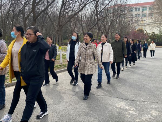 老师们热情高涨,充满活力,一起舒展筋骨,做好热身活动。在领队的带领下,健步走活动开始。大家甩臂迈步,边走边聊,一边观赏校园美景,一边享受运动带来的激情和活力。一路欢声笑语,为2021年初春校园及周边留下了一道亮丽的风景线。