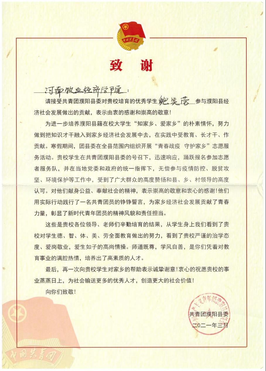 2021年的春节,在阻止疫情反弹的特殊时期,艺术学院2018级环设04班学生鲍笑莹,积极主动担当作为,加入共青团濮阳县委开展的“青春战疫、守护家乡”2020年寒假返乡大学生志愿服务活动中,表现优异,荣获“优秀大学生志愿者”称号,同时收到来自共青团濮阳县委的感谢信。