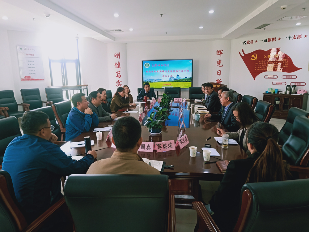 4月9日,动物科技学院副院长牛晖,李婉涛教授、刘卫东教授,动物生产教研室主任韩占兵、畜牧环境工程与设施教研室主任段海涛、动物营养与饲料科学教研室主任霍文颖、动物遗传育种与繁殖教研室主任张景锋、应用技术教研室主任黄安群等一行八人到河南农业大学动物科技学院进行调研交流。