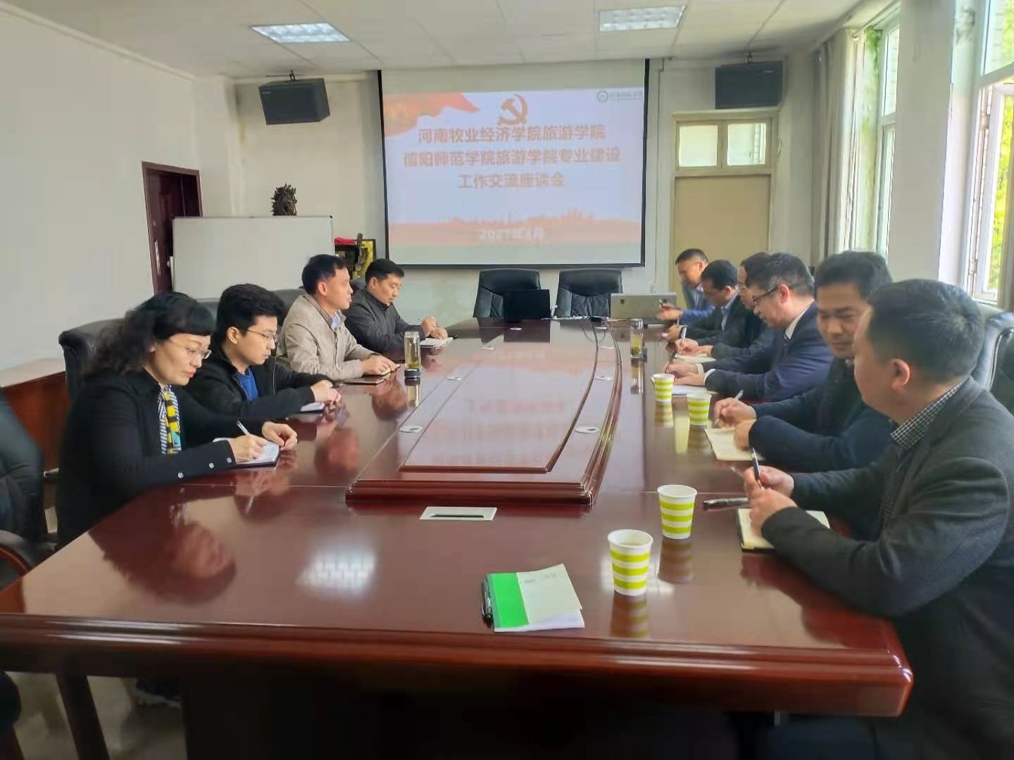 4月9日,旅游学院党委书记李喜民、院长王德静、副院长王中雨及会展经济与管理教研室、酒店管理教研室、景区管理教研室负责人、教师代表赴信阳师范学院旅游学院调研一流专业建设情况,与信阳师范学院旅游学院院长彭荣胜、副院长郭俊升,旅游管理系主任、酒店管理系主任及教师代表在信阳师范学院旅游学院会议室进行座谈。