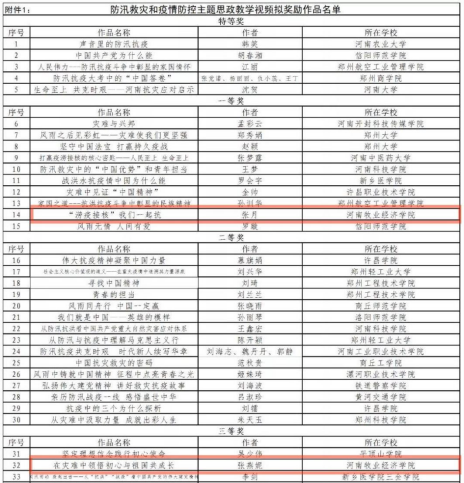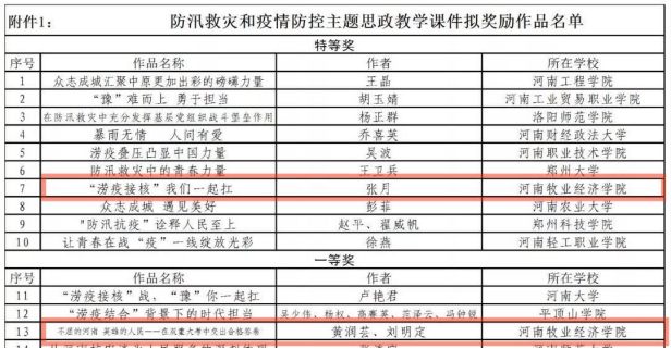 近日,河南省教育厅官网发布《关于防汛救灾和疫情防控主题思政教学课件、教学视频评审结果的公示》,威尼斯官网马克思主义学院教师分别取得教学课件特等奖1名、一等奖2名,教学视频一等奖1名、三等奖1名的好成绩。