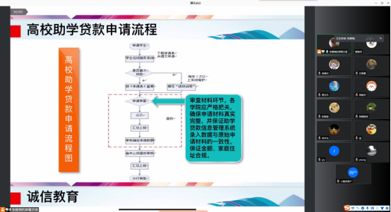 贾艳艳指出,各位辅导员要认真学习学生资助工作的相关政策,熟悉学生资助工作流程,掌握学生资助工作相关技能,为下阶段开展奖助工作奠定坚实基础。她表示,在奖助贷评定过程中,要按照规定程序细致认真开展工作,坚持公平、公正、公开的评选规定,确保优秀学生获得奖学金的鼓励,确保把助学金用到真正需要的学生身上。