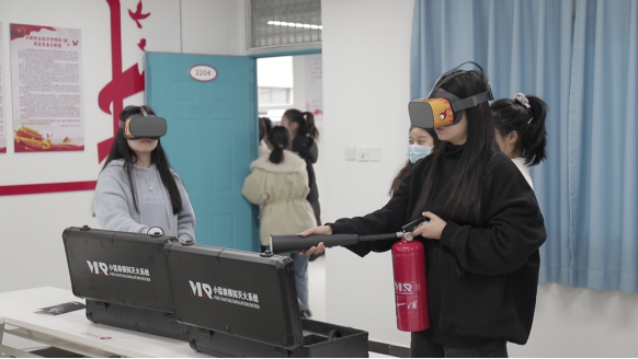 此次走进校园的VR灭火模拟体验系统内含MR灭火模拟系统与MR模拟灭火装置,结合沉浸式交互体验,真实使用灭火器体验发现火情到扑灭火灾的全过程,通过虚拟现实技术提示大众加强安全消防意识。体验者可以使用该设备进行灭火器使用规范学习、灭火器操作训练以及各常见场景火灾模拟灭火情景。