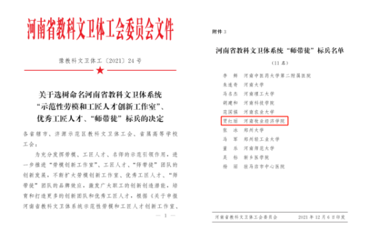 近日,河南省教科文卫体工会委员会印发《关于选树命名河南省教科文卫体系统“示范性劳模和工匠人才创新工作室”、优秀工匠人才、“师带徒”标兵的决定》(豫教科文卫体工〔2021〕24号),威尼斯官网旅游学院教师贾红丽荣获河南省教科文卫体系统“师带徒”标兵荣誉称号,此项荣誉全省仅有11对。