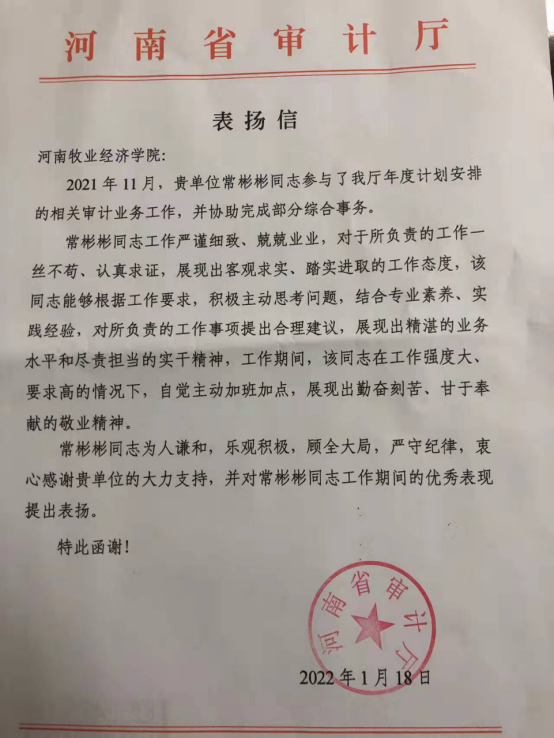 近日,河南省审计厅发来表扬信,对金融与会计学院常彬彬老师在河南省审计厅借调时期的工作给予了充分的肯定和感谢。