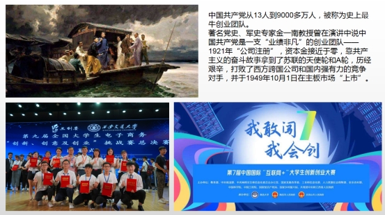 李艳菊教授在《电子商务概论》的绪论课中向学生展示了“史上最牛创业团队——中国共产党”的奋斗历程,并将党史与创新过程、创业技巧相结合,着力引导学生积极参加电子商务“创新、创意及创业”挑战赛、互联网+大学生创新创业大赛等学科竞赛,帮助学生进一步丰富知识体系、扩大知识范围、提升眼界,树立和坚持正确的党史观,培养学生创造性解决问题的能力和思维。