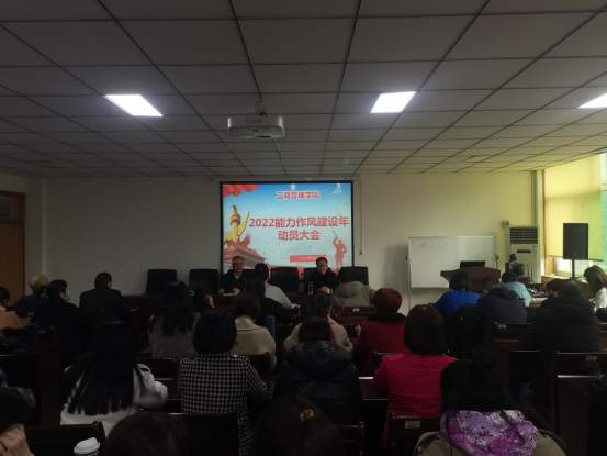 3月3日,工商管理学院在英才校区教学楼227会议室召开2022“能力作风建设年”动员大会,学院全体领导班子成员和教工参加动员会。会议由工商管理学院党委书记王筝主持。