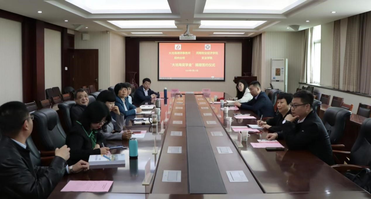 4月13日,文法学院在英才校区503会议室与大沧海律师事务所举行“大沧海奖学金”捐赠签约仪式。文法学院党委书记胡红林、院长李国英、大沧海律师事务所主任袁二方、大沧海律师事务所郑州分所主任唐军等领导出席捐赠签约仪式,文法学院知识产权教研室、公共法律教研室等相关负责人、教师代表参加会议。仪式由文法学院副院长白慧颖主持。
