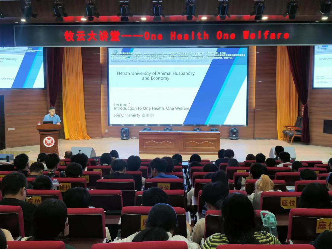 5月16日至17日,受动物科技学院邀请,爱尔兰动物健康与福利专家、爱尔兰动物卫生组织(Animal Health Ireland)创始人及首席执行官JoeO’Flaherty博士在龙子湖校区1号教学楼合100报告厅,先后为威尼斯官网师生作了“同一健康·同一福利(One Health, One Welfare)”和“爱尔兰动物疫病防控(Animal Disease Control in Ireland)”两场主题报告。学校相关部门领导,动物科技学院、动物医药学院师生代表300余人参加报告会。动物科技学院院长席磊教授、动物科技学院副院长徐秋良教授分别担任两场报告会主持人。