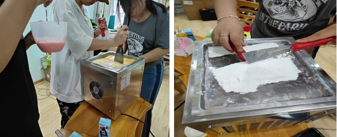 心理健康协会的志愿者向同学们介绍了炒酸奶需要的材料、工具以及方法。通过牛奶、果味酸奶粉、原味酸奶等材料调配,现场DIY体验让每一份亲自调味出的“甜品”都有自己独特的味道。在志愿者的指导下,同学们们认真地摆放着自己的炒酸奶造型,大胆地展示着自己的创意,酸甜可口的炒酸奶制作非常成功。大家都纷纷表示想要“续杯”。一句“我要再来一份!”让快乐延续,共度清凉一夏。