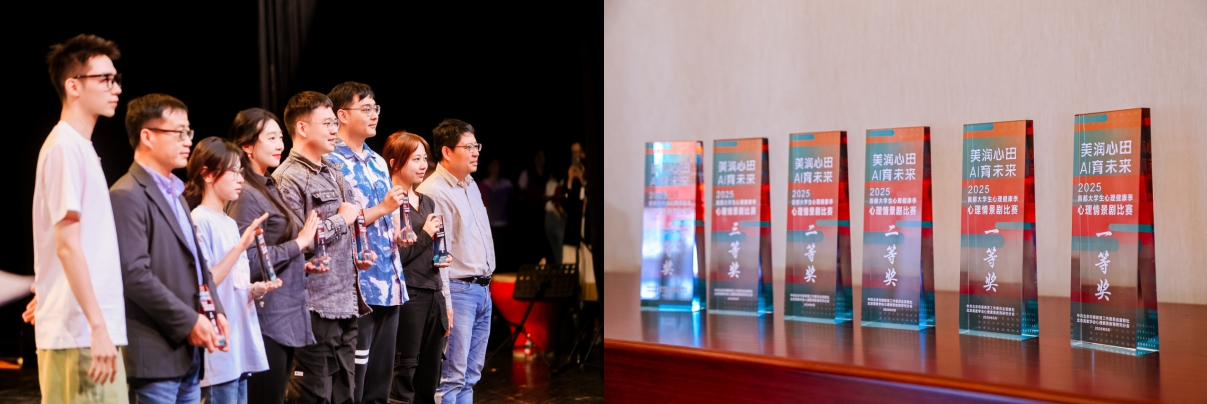 舞台上演员们用细腻的表演,将生活中的现实困境与内心冲突真实还原。那些在学习压力下的焦虑、人际交往中的迷茫、情感挫折后的失落,都通过生动的情景对话、精彩的角色扮演一一呈现。随着剧情推进,主人公们从迷茫到觉醒、从困顿到成长的转变,不仅引发了观众的强烈共鸣,更让大家看到了心灵成长的力量。比赛聚焦“做自己人生导演”的理念,用艺术表达为心灵赋能。当AI元素融入剧情,同学们对心理健康有了全新的思考,也感受到科技在守护心灵健康上的无限可能。最终6 部作品凭借出色的表现收获了属于自己的荣耀,现场掌声雷动,既是对演员们的肯定,也是对心理健康教育的致敬。