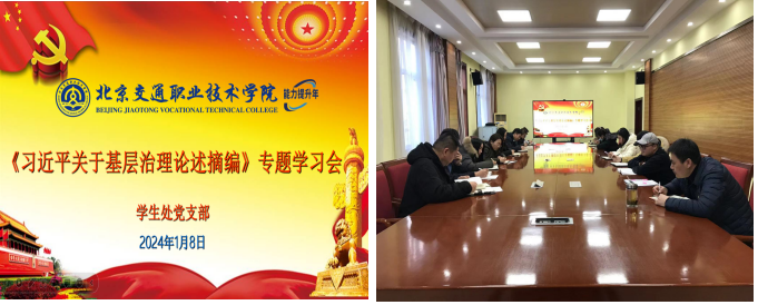 为深入学习贯彻习近平新时代中国特色社会主义思想,全面贯彻落实习近平总书记提出的一系列关于基层治理工作的重要论述、重要讲话和重要批示,深入理解新时代“枫桥经验”的内涵。同时教育引导党员干部加强作风建设,严明纪律规矩,坚持廉洁底线, 2024年1月8日上午,学生处党支部在办公楼一层会议室召开专题学习会和“一小时纪律教育”党纪学习会,支部全体党员参会。