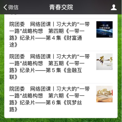 为引领当代大学生将学习生活与国家战略相结合,更好地融入“一带一路”伟大征程,5月24日我院团委开展第四期团课——《习大大的“一带一路”倡议构想》网络团课。本次团课通过团委“青春交院”微信平台发布《习近平带你领略千年丝绸之路——大道之行》微视频及《一带一路》视频纪录片。