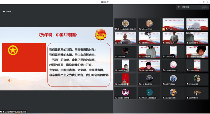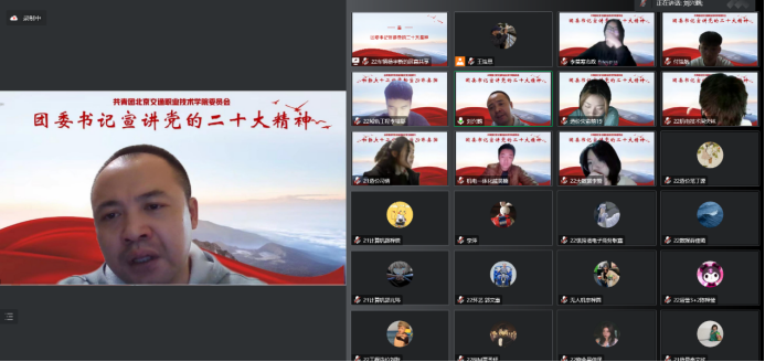 为宣传学习二十大讲话精神,充分发挥基层团组织的积极性和主动性,提高青年学生的思想认识水平,我院于2022年12月11日晚18:00在腾讯会议组织召开本学期第五期主题团课——《党的二十大精神宣讲活动暨团委书记讲团课》。此次团课学习特别邀请了我院党委委员、学生处处长兼团委书记刘兴鹤老师为大家进行宣讲。此次会议的参会人员主要有2022级各班级团支书、班长;2021级各班级团支书;各系主席团、团总支成员;院团委各组织、院学生会主席团、各部门负责人参会,同时开放了120个公共名额面对全体青年学生开放学习。
