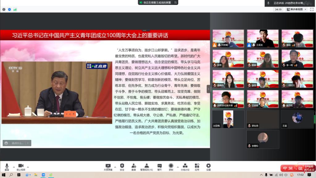为学习贯彻习近平总书记“庆祝中国共青团100周年大会”重要讲话精神,带领全院做好会议精神的践行者、学习者,深刻体会总书记重要讲话精神,我院团委组织开展会议精神热议专题学习系列活动,组织团学干部通过线上学习的方式又共同学习共青团中央书记处第一书记贺军科同志在庆祝中国共产主义青年团成立100周年大会上的发言。